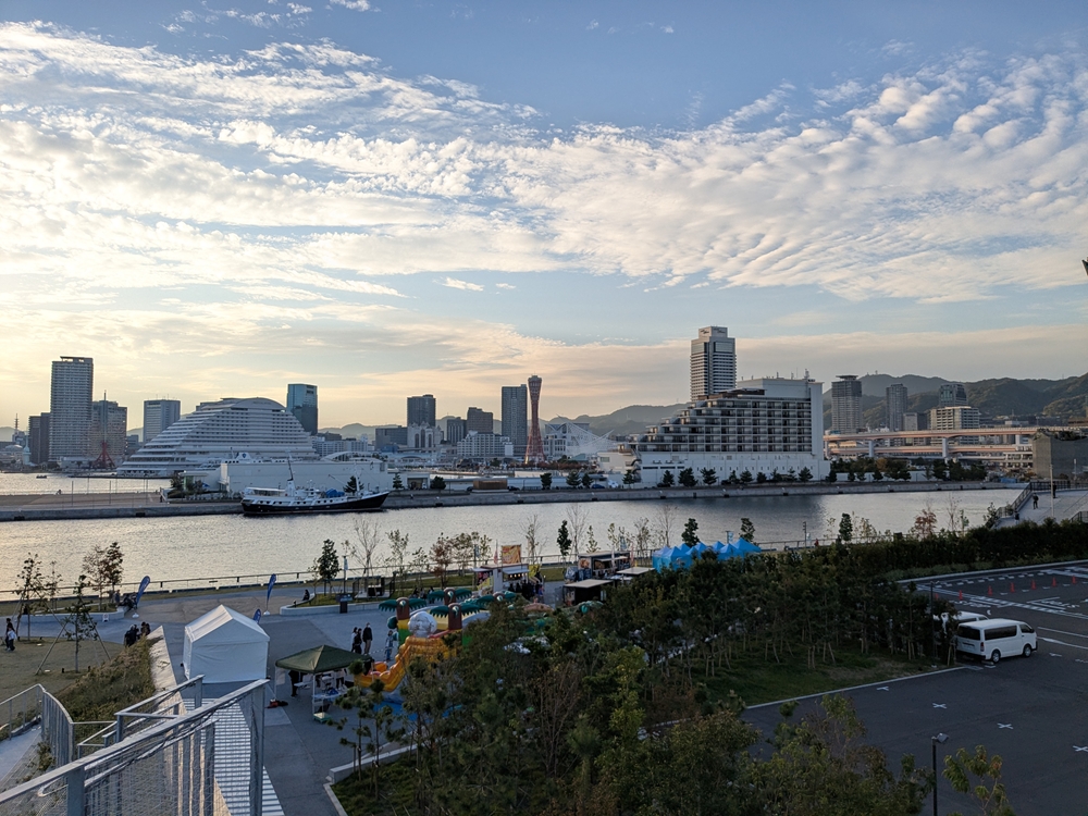 そこから右手を見ると、神戸のシンボルであるポートタワーやホテルが並びます。アリーナから見て西側に位置しているため、夕暮れ時はまさに美景です。