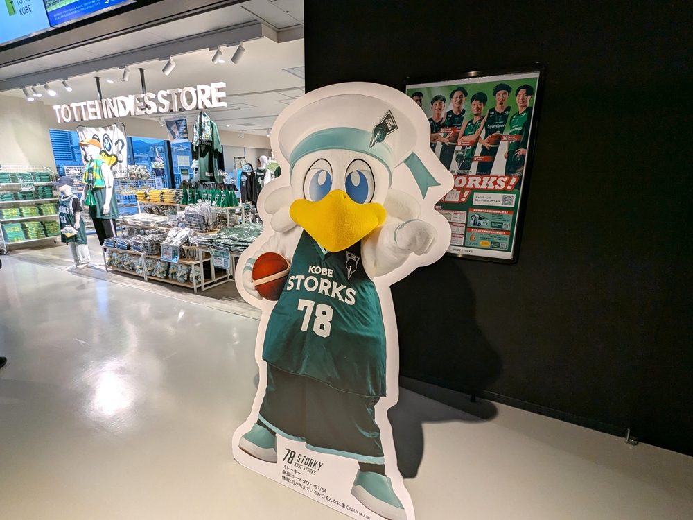 右手には常設のグッズショップがあり、地元企業ユーハイムとのコラボ商品やマスコット「ストーキー」のアイテムがずらり。